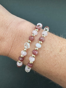 Rose, Strawberry & Clear Quartz Skinny Stacker Bracelet (6mm beads)